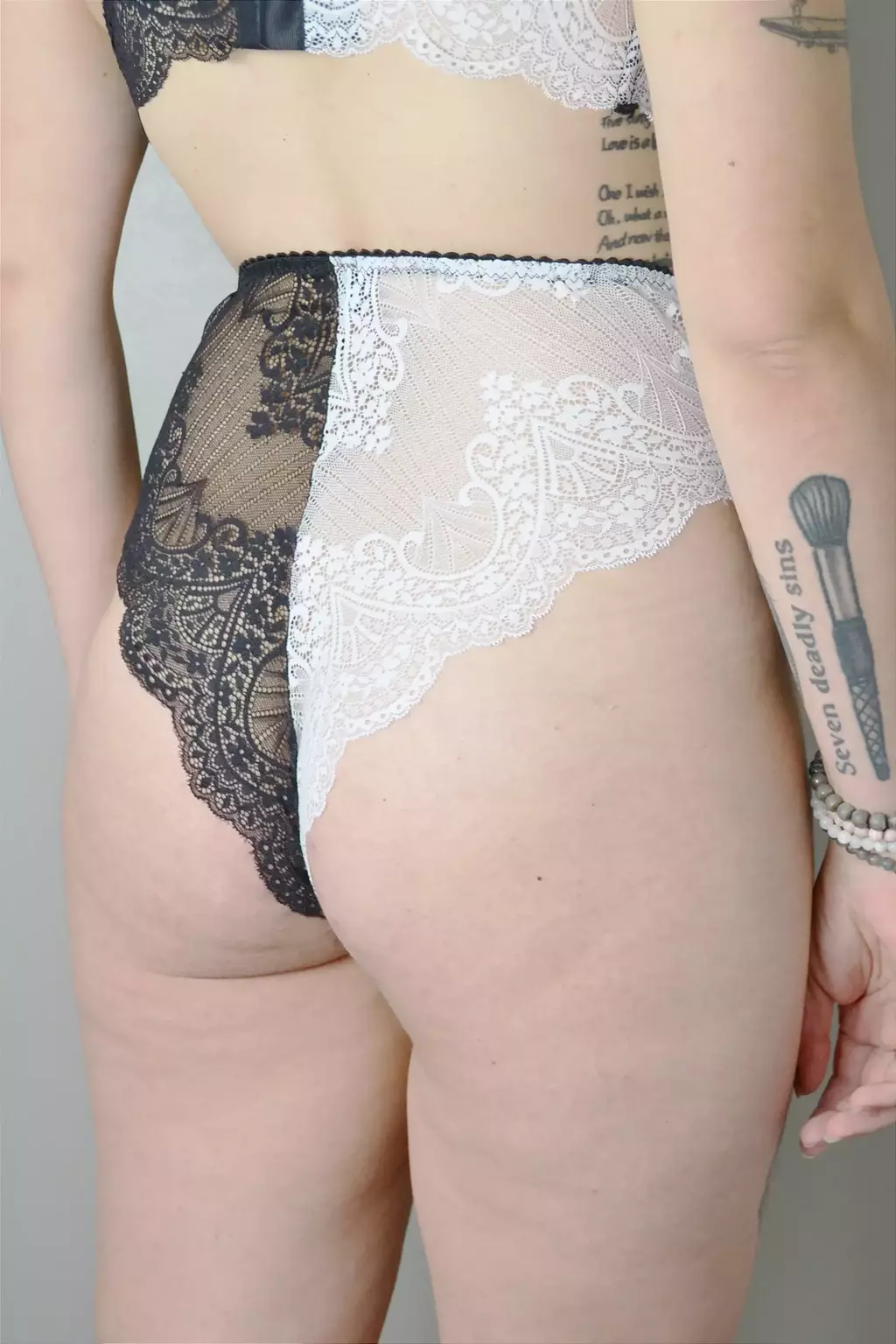 Calcinha estilo caleçon cós alto e cavada em Renda poliamida com elastano. Dividida entre duas cores de renda: preta* e branca* - inspirada nas cores da vilã Cruella. Lacinho de cetim na cor vermelha* no centro. Modelo com altíssima elasticidade, toque de seda e muito conforto. Fundilho 100% algodão.