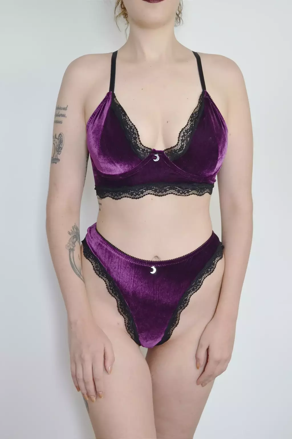 Calcinha asa delta e alta, inteiramente em veludo com elastano na cor roxo* com acabamento em renda poliamida estreita preta*. Tecido sem transparência. Modelagem pensada no conforto. Peça mais estreita nas costas, trazendo mais sensualidade a peça! Pingente lua aço inoxidável no centro frente. Fundilho 100% algodão.
