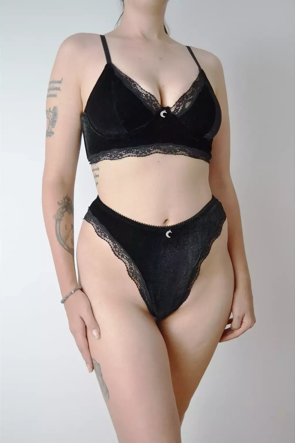 Calcinha asa delta e alta, inteiramente em veludo com elastano na cor preta* com acabamento em renda poliamida estreita preta*. Tecido sem transparência. Modelagem pensada no conforto. Peça mais estreita nas costas, trazendo mais sensualidade a peça! Pingente lua aço inoxidável no centro frente. Fundilho 100% algodão.