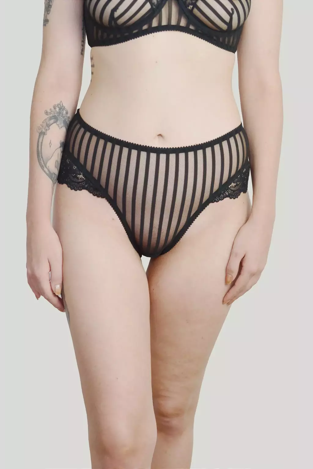 Modelo biquíni em tule listrado cor preta*. Modelagem extremamente confortável levemente alta e fundilho mais larguinho. É uma peça muito delicada e veste perfeitamente no corpo - peça básica must have. Detalhes em renda floral poliamida nas laterais na cor preta*. Fundilho 100% algodão.
