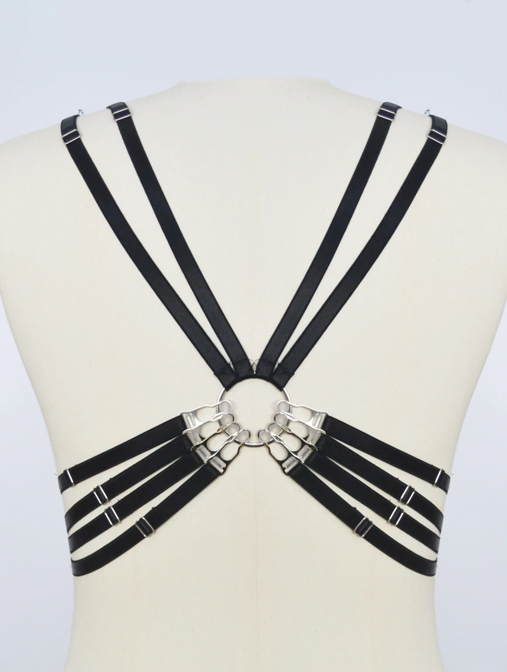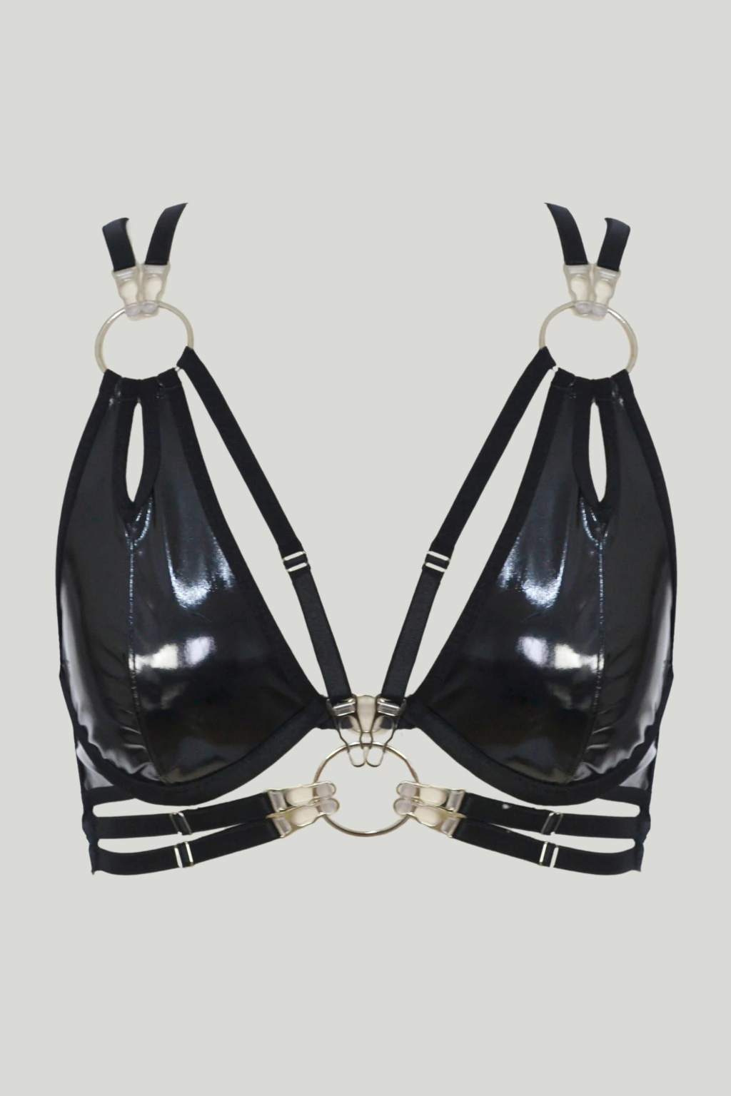 Modelo triângulo alongado - confeccionado em vinil com elastano na cor preta*. Alças 10mm com reguladores e argola 4cm. Base em elástico 10mm, toda regulável - peça com excelente sustentação! Peça com aro e sem bojo. Ideal para todos os tipos de busto - com volume, volume moderado ou baixo volume. Detalhes em elásticos 10mm com reguladores no busto e argola 4cm no centro da peça. Lateral com barbatana. Costas em elásticos 10mm todos com reguladores em metal niquelado.